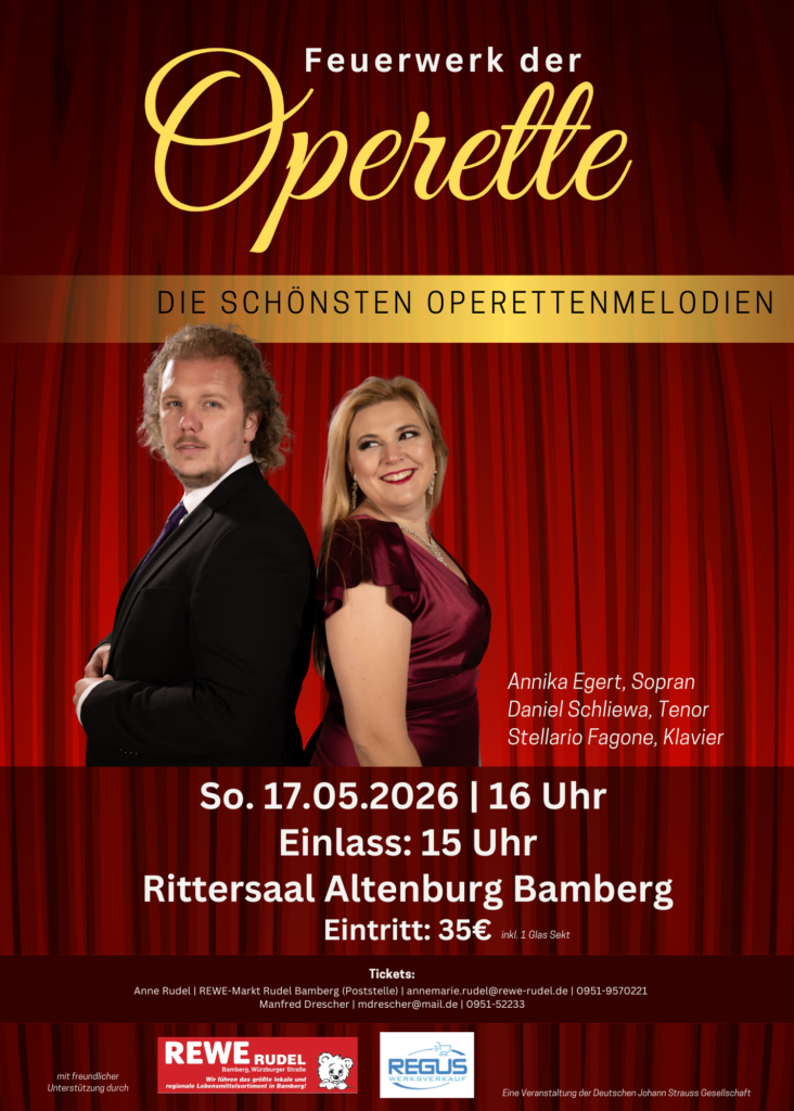 Unsere Stipendiatin und Vorstandsmitglied Annika Egert wird mit Ihrem Mann die schönsten Operettenmelodien auf der Altenburg Bamberg präsentieren.